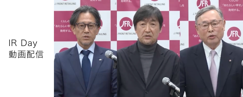 トップメッセージ 統合報告書 IR Day 動画配信 Pride Fund J.FRONT PLUS JFR MIRAI CREATORS FUND サステナビリティ サブスクリプション事業 ハイブリッド型ビジネスモデル「大丸心斎橋店本館」 次世代商業空間 新生「渋谷パルコ」 GINZA SIX サステナビリティに関するレポート 採用情報 会社案内 Corporate Information IR情報 IR Information サステナビリティ Sustainability ニュース&トピックス お知らせ 決算説明会 Presentations 統合報告書 Integrated Reports 重点施策 Strategies 株主様ご優待情報 IR説明会 IR Presentations よくあるご質問 Frequently Asked Questions