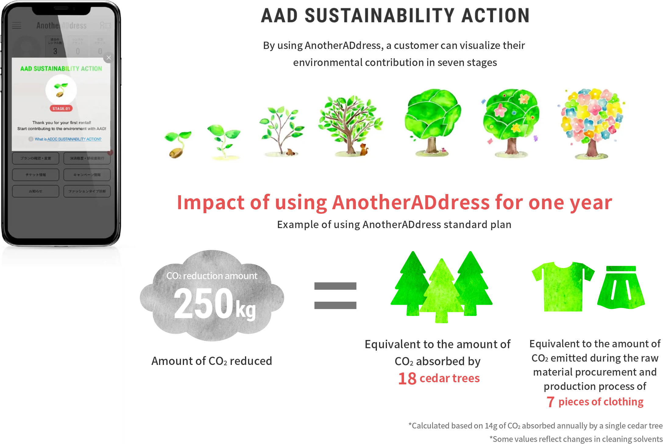 This contribution is visualized across seven stages as the "Environmental Contribution of AnotherADdress." By using this fashion subscription service, customers can enjoy fashion each month while accumulating action points. We have launched "AAD SUSTAINABILITY ACTION," which allows customers to track their contribution to the reduction of GHG emissions at each stage.