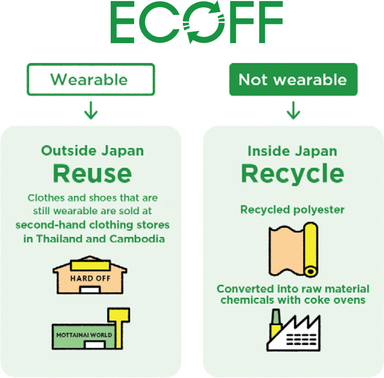 Launched by Daimaru Matsuzakaya Department Stores in FY2016, ECOFF is a sustainable initiative to collect unwanted clothing, shoes, bags, and other items from customers at department stores and recycle and reuse them into new materials and products. The initiative has continued to grow every year thanks to the increasing environmental awareness of customers and their active participation. The volume of items collected in FY2024 was 323 tons (cumulative total: 2,168 tons since FY2016).