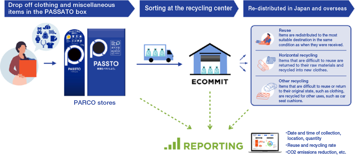 In June 2024, PARCO and ECOMMIT Inc. introduced PASSTO to five PARCO stores (Kichijoji, Hibarigaoka, Chofu, Kinshicho, Fukuoka). PASSTO is an ECOMMIT service that collects, sorts, and redistributes unwanted items in one integrated process, with the aim of reducing local waste and contributing to resource recycling.