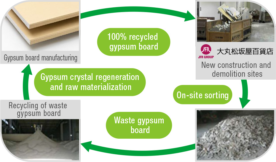In the interior renovation work at Daimaru Matsuzakaya Department Stores, starting with the renovation of Matsuzakaya Nagoya Store in FY2025, we have been implementing horizontal recycling of gypsum board by: using 100% recycled gypsum board, and 2 sending waste gypsum board generated during demolition work to a factory capable of reprocessing it back into raw material for gypsum board.